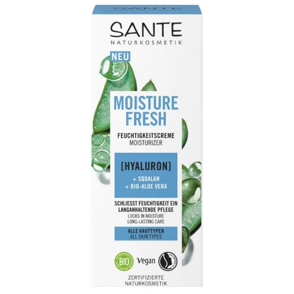 SANTE mitrinošs sejas krēms MOISTURE FRESH. Krēms nodrošina tūlītēju un intensīvu ādas mitrināšanu. Ik dienu papildina ādas mitruma rezerves, lai tā būtu svaiga un kopta. Aizsargā ādu no apkārtējās vides negatīvās ietekmes. Ar hialuronskābi, skvalānu un ekoloģisku alveju. Piemērots visiem ādas tipiem.