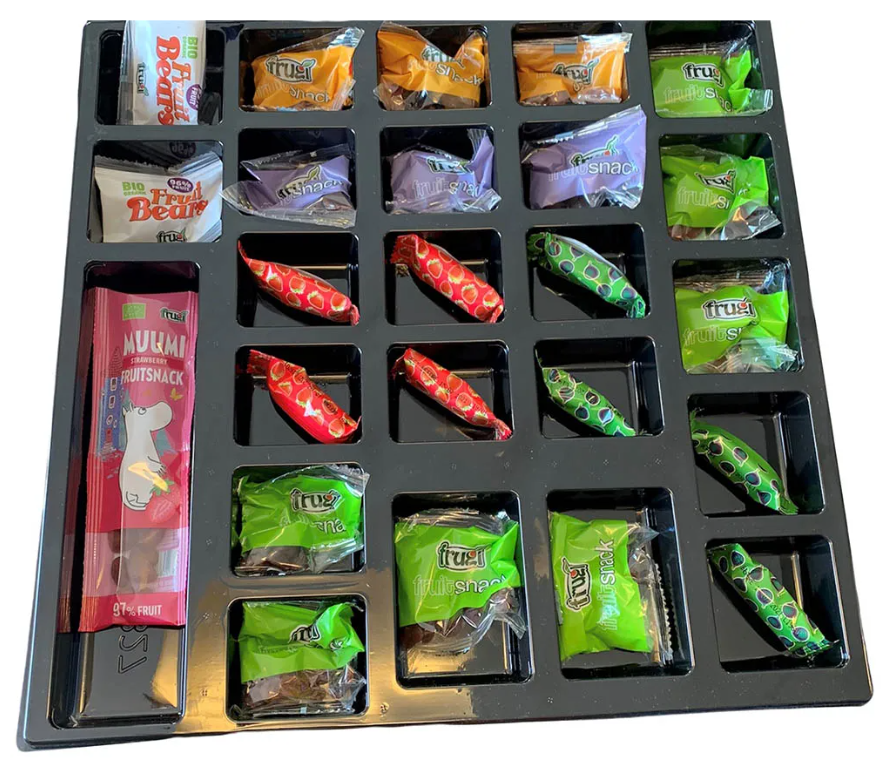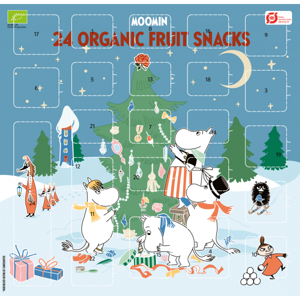 Adventes kalendāra MUUMI CHRISTMAS iekšpusē atradīsiet gardus ekoloģiskus žāvētu augļu pārsteigumus: mazus augļu batoniņus, augļu uzkodas, rozīnes, augļu lācīšus.