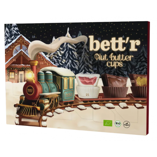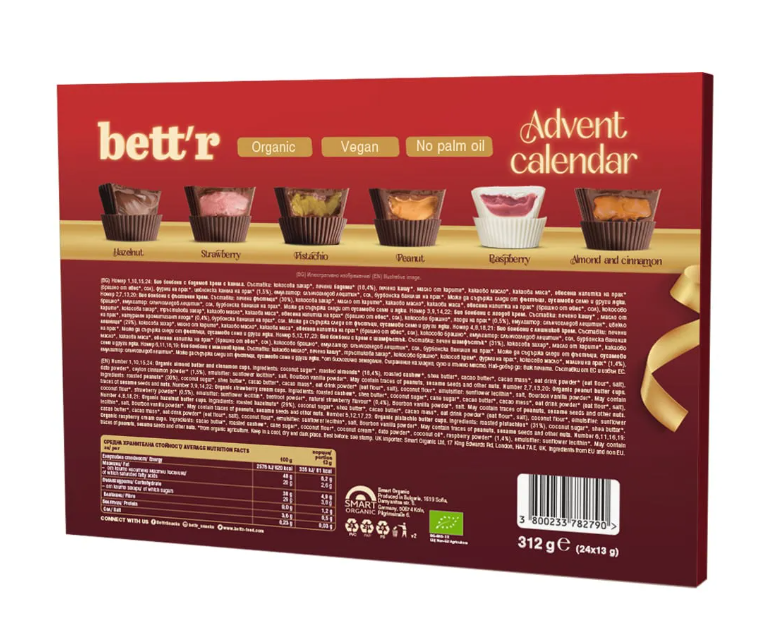 Šis ir grezns svētku kārums ar 24 vegāniskām konfektēm un 6 ekskluzīvām garšām (mandeļu, kanēļa, zemesriekstu, zemeņu, lazdu riekstu, pistāciju un aveņu).