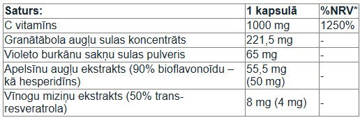 Sastāvdaļas: L-askorbīnskābe, granātābola (Punica granatum) augļu sulas koncentrāta pulveris, kapsulas apvalks (liellopu izcelsmes želatīns), violeto burkānu (Daucus carota) sakņu sulas pulveris, standartizēts apelsīnu (Citrus sinensis) augļu ekstrakts 10-12:1 (90% bioflavonoīdu - kā hesperidīns), standartizēts vīnogu (Vitis vinifera) miziņu hidroetanola ekstrakts 200:1 (50% trans-resveratrola), nesējviela (dabiskas izcelsmes maltodekstrīns).