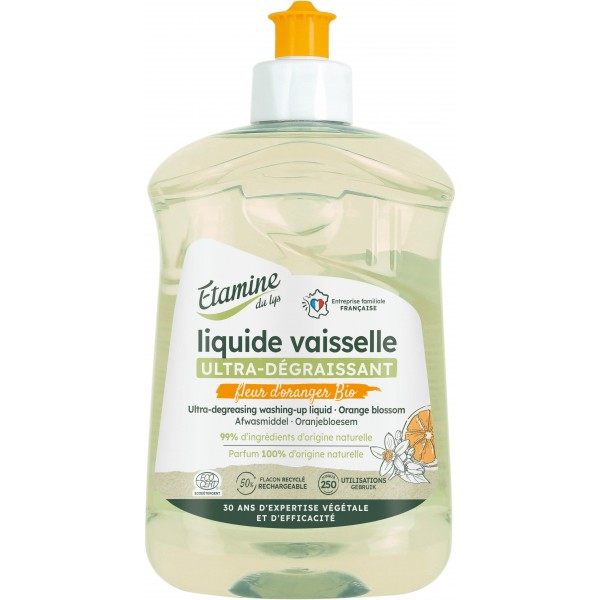 „Etamine du Lys“ trauku mazgāšanas līdzeklis ar apelsīnu ziedu ūdeni. Trauku mazgāšanai ar rokām. Viegli nomazgā taukus. Līdzeklim ir ECOCERT sertifikāts.