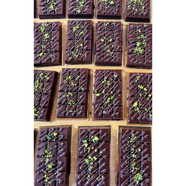 Maiga piena šokolāde ar pildījumu (Kataifi mīkla, pistāciju pasta un tahini pasta).